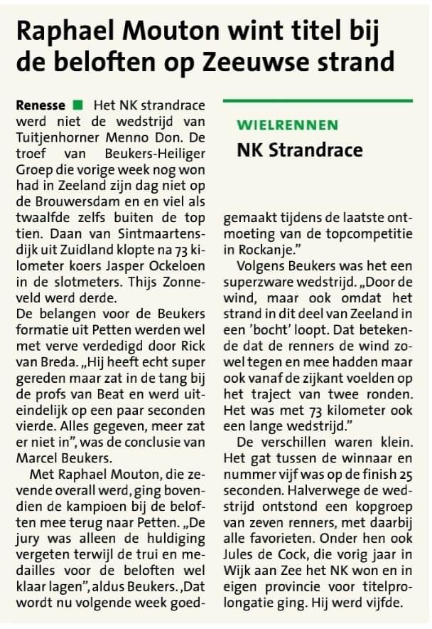 De langste race van het jaar, 73 kilometer, over het strand van Zeeland.. Het Nederlands Kampioenschap in Renesse was een ”slagveld” door de wind en het verradelijke strand dat in een bocht loopt. Daardoor veranderd de windrichting constant en dat leverde mooie resultaten op voor onze mannen!